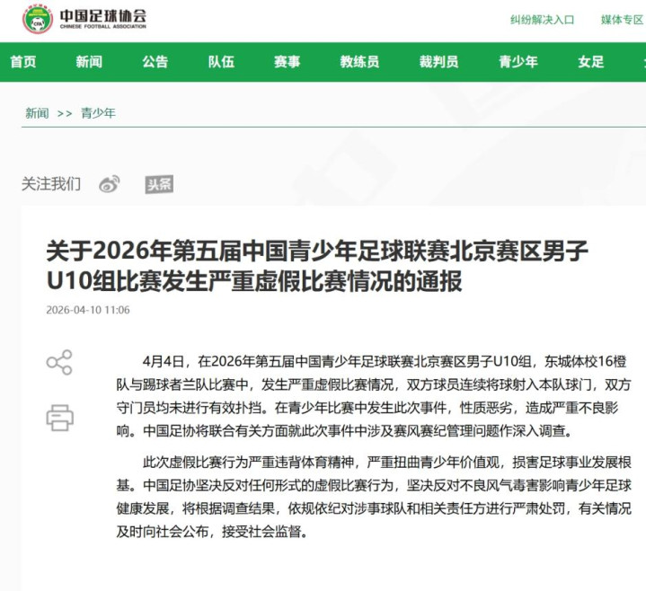 4月4日,在2026年第五届中国青少年足球联赛北京赛区男子U10组,东城体校16橙队与踢球者兰队比赛中,发生严重虚假比赛情况,双方球员连续将球射入本队球门,双方守门员均未进行有效扑挡。在青少年比赛中发生此次事件,性质恶劣,造成严重不良影响。中国足协将联合有关方面就此次事件中涉及赛风赛纪管理问题作深入调查。