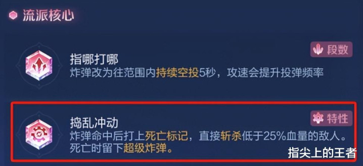 二技能的天赋一定要选【捣乱冲动】,这也是骑炮流的收割核心技能,二技能命中目标后,低于25%血量的目标会被直接击杀,普攻也好,大招也好,都可以触发这个效果。
