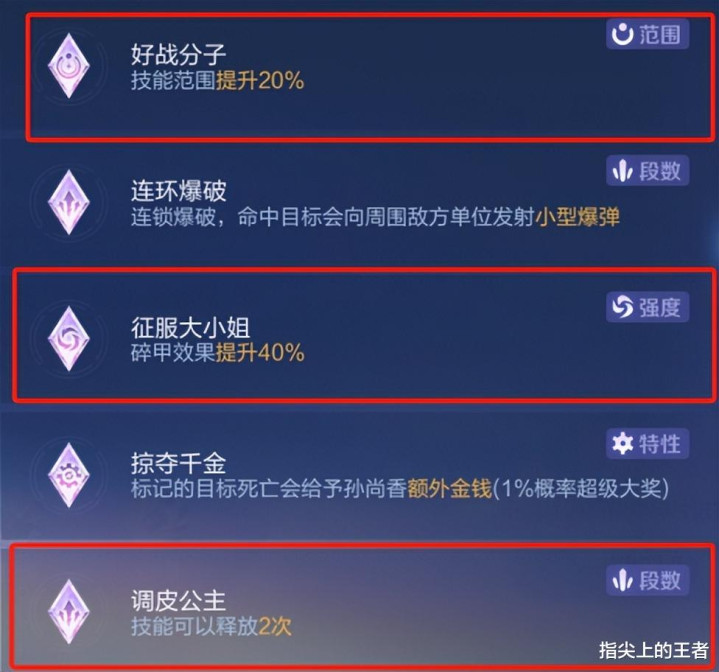 优选这三个,【好战分子】提升二技能范围,降低打空概率,【征服大小姐】提升破甲效果,50%的破甲加35%的穿透,走肉装的英雄也根本吃不住伤害,而【调皮公主】连续两次来提升容错。