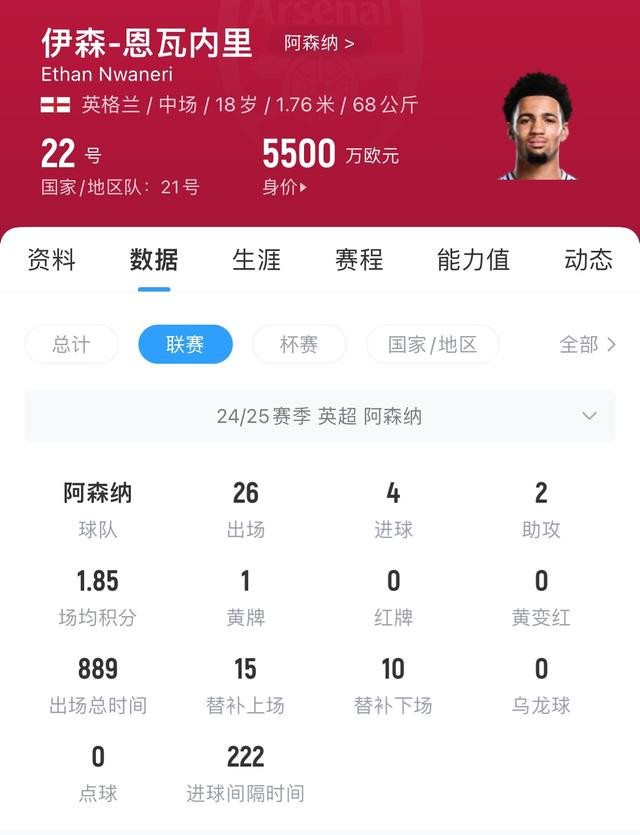 恩瓦内里现年18岁,现身价5500万欧,他上赛季代表阿森纳各项赛事出战37次,贡献9球2助攻。他与阿森纳的合同将在明年到期。据此前媒体报道,他与阿森纳的续约谈判还未达成一致。