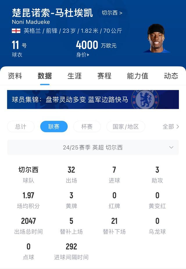 23岁的马杜埃凯当前身价4000万欧元,本赛季32场英超贡献7球3助攻。