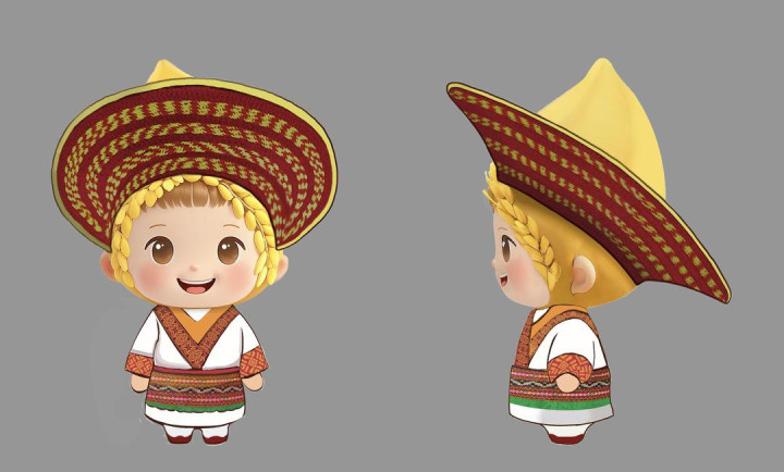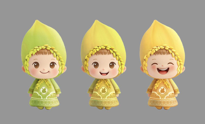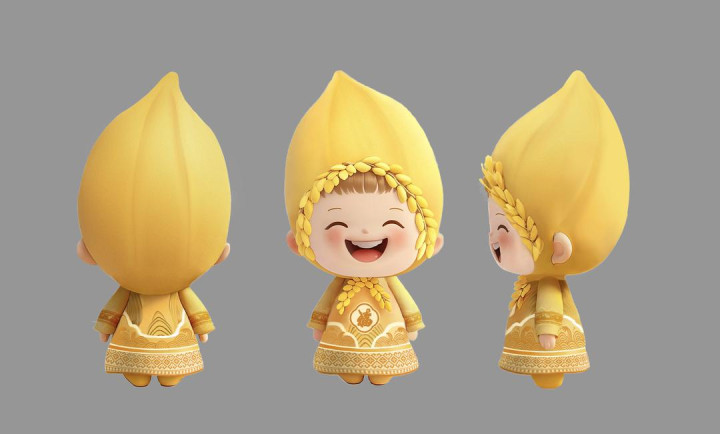 第五届湖南旅游发展大会吉祥物为“福满满”,以金色饱满的水稻种子为原型,象征着稻谷满仓的盛景。胸前“福”字与金色稻谷搭配,展示世界杂交水稻发源地“从土地到福气”的转化,也象征着“抱福回家”的美好愿景。服装花纹融合雪峰山脉绵延之势与沅水奔涌之态,蕴含“雪峰南迤,跨桂林,越五岭,巍巍荡荡雄楚望;沅水北去,汇洞庭,奔长江,浩浩汤汤问苍茫”的意境。袖口点缀的高庙遗址凤鸟图纹与衣服下摆的侗族织锦纹样交相辉映,共同诉说着这片土地上生生不息的文化传承与独特魅力。