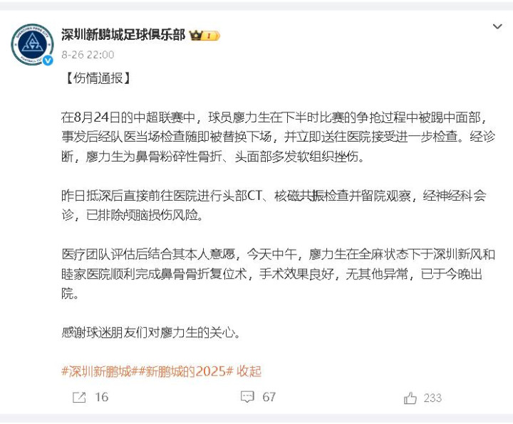 他是在下半场在争抢过程中被对方球员踢中面部,事发后经队医当场检查随即换下场,并立即送往医院进一步检查,经诊断,廖力生为鼻骨粉碎性骨折、头面部多发软组织挫伤,昨天抵深后直接送往医院进行头部CT、核磁共振检查并留院观察,经神经科会诊,已经排除颅脑损伤的风险,医疗团队评估后结合其本人意愿,如今廖力生在全麻状态下顺利完成鼻骨骨折复位术,手术效果良好,已经今天晚上出院!