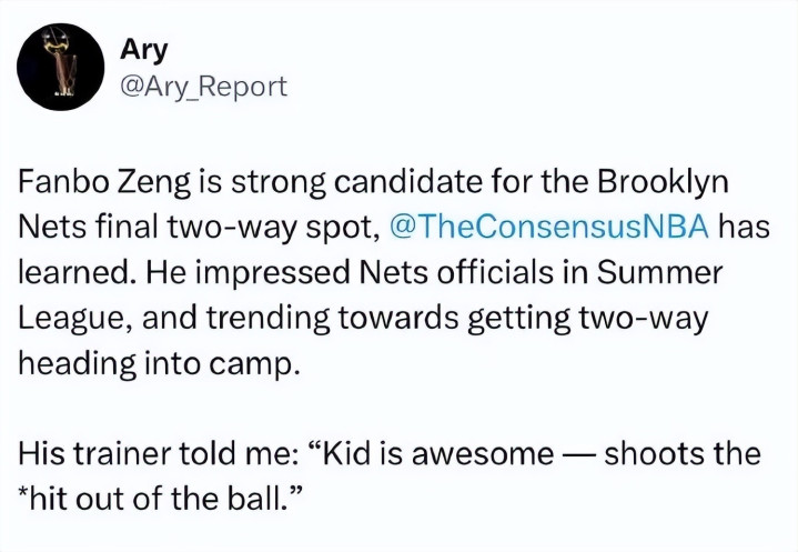 说到了篮网,就不得不提我们的曾凡博。据美记Ary透露,曾凡博成为篮网最后一个双向合同名额的有力人选,随着训练营临近前者获得双向合同的趋势日益明显。