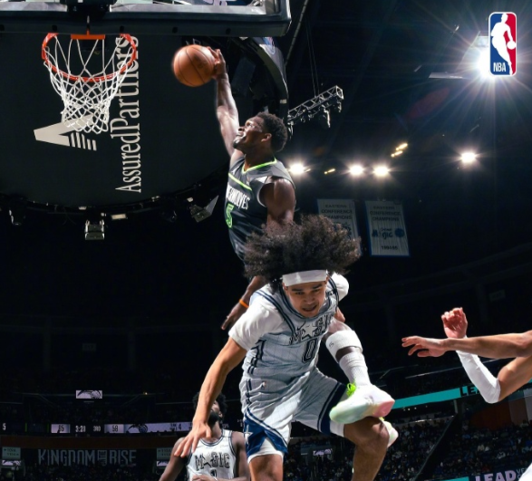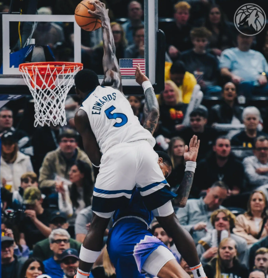 爱德华兹的弹跳同样不含糊,比赛里各种高难度扣篮信手拈来。不管是快攻时的飞身劈扣,还是阵地战里顶着几个人防守强行起跳扣篮,他都做得有模有样。速度和敏捷性也没话说,跑位、补位都特别及时,在场上移动起来灵活得像只猎豹,各种高难度动作都能轻松完成,森林狼的进攻离了他可真不行。