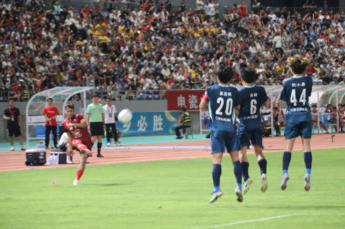 随着主裁判的一声哨响,双方迅速展开激烈争夺。上半场,萍乡队7号球员谭永华接9号球员沈文剑任意球助攻,一脚垫射,率先拿下1分。但随后,吉安队迅速做出回应,同样攻入一球,场上比分瞬间扳平。萍乡队保持队形,继续发起猛攻。在获得禁区前任意球机会后,9号球员沈文剑绝技再现,直接轰门得手。看台上万名球迷瞬间掀起欢腾的浪潮。中场结束,萍乡队以2:1领先吉安队。