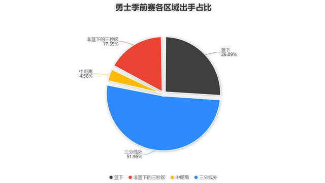 第二个利好是新赛季规则的修正,特别是对于三分线外侵犯投篮人的犯规更加严谨,之前许多防守外线投篮时影响到出手人的轻微接触,以及当球出手后的非明显接触都不会被认为是投篮犯规,但新赛季NBA修正了此规则,与以往相同,勇士队季前赛三分线外的出手比重就是各区域出手中的最高,这也令三分出手颇多的勇士队获益特别是斯蒂芬库里。