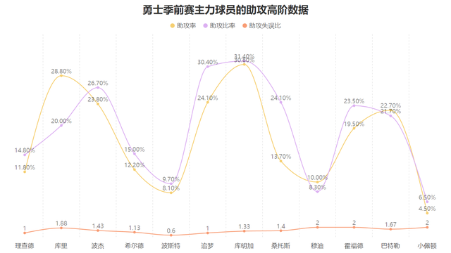 从季前赛来看,霍福德虽然基础数据看起来平庸,但他送出助攻数占总处理球数的助攻率为19.5%,在场每百回合有助攻回合的助攻比率为23.5%,助攻失误比为2,三项高阶助攻数据优秀意味着他非常适合勇士的传切体系,即使是中锋但他有高效的助攻表现。